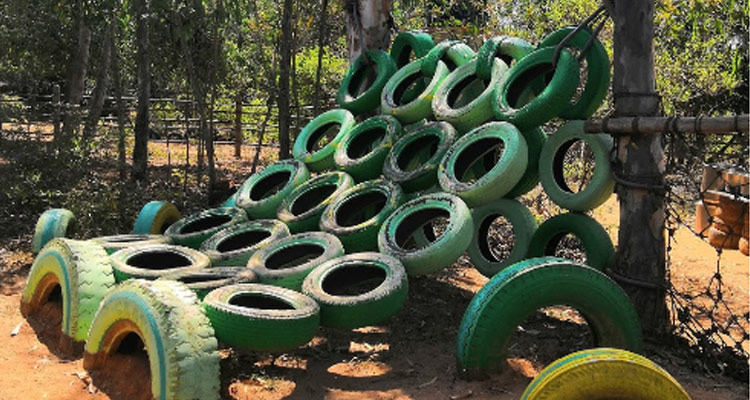 The outdoor play area includes tyre swings, a beam balance built of discarded tyres, a hurdle climb, and tin box drums. They also have a large hut to conduct daily meetings and discuss novel ideas and initiatives. As far as electricity is concerned, they are able to charge their mobile devices only once a day, for not more than a couple of hours. This is possible thanks to the seven generators installed in the premises.